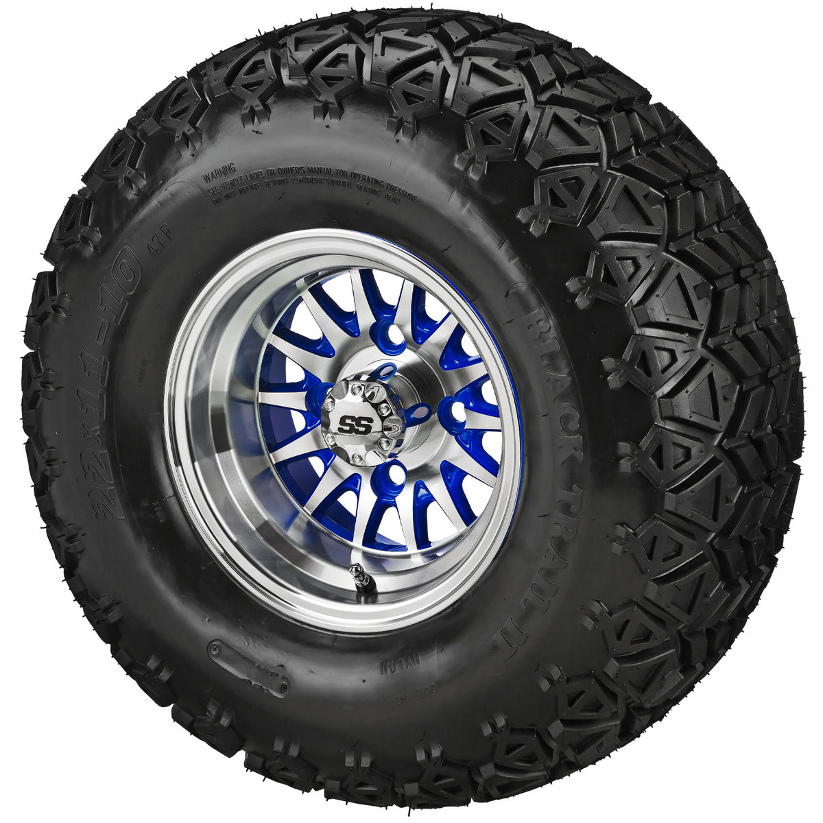 Give your golf cart a bold, custom look with the LSI 10” 14-Spoke Blue & Machined wheel paired with lifted all-terrain tires. This mounted combo delivers extra clearance and confident grip on turf, gravel, and neighborhood streets—while keeping install fast and simple for lifted builds.